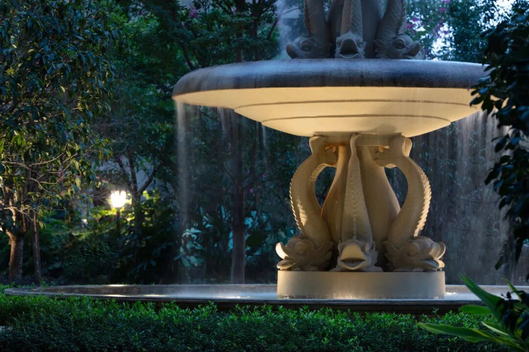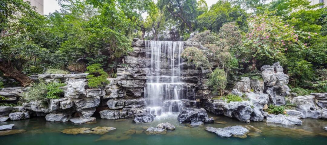 项目内部采用双层结构设计,呼应内部环境层次,入口打破常规,以一副独立的“景观画”开场,特色置石位居中位,辅以植物组团,涌泉水景,整体搭配乍看杂乱无章,仔细品味却散发出一种艺术的柔美感,独特的场景达到引人入胜的效果。