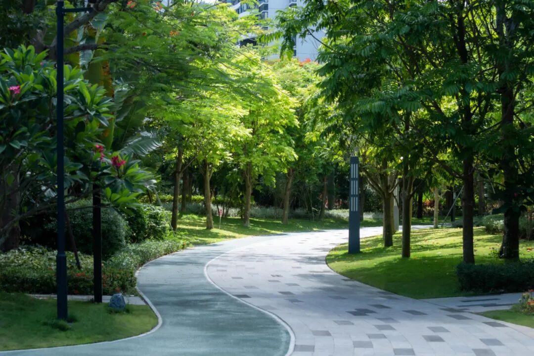 住宅外部是一条业态丰富的商业街区,因此设计师利用“广场式入口”便于行人集散、停留。通过门体、植物、石头、雕塑、灯饰等组成,突出入口位置,强调入口空间的层次感。再以高差错位打造,扶梯连接上下空间,满足多元化的功能需求,整体设计呈现亚热带风情,与住宅风格相辅相成。