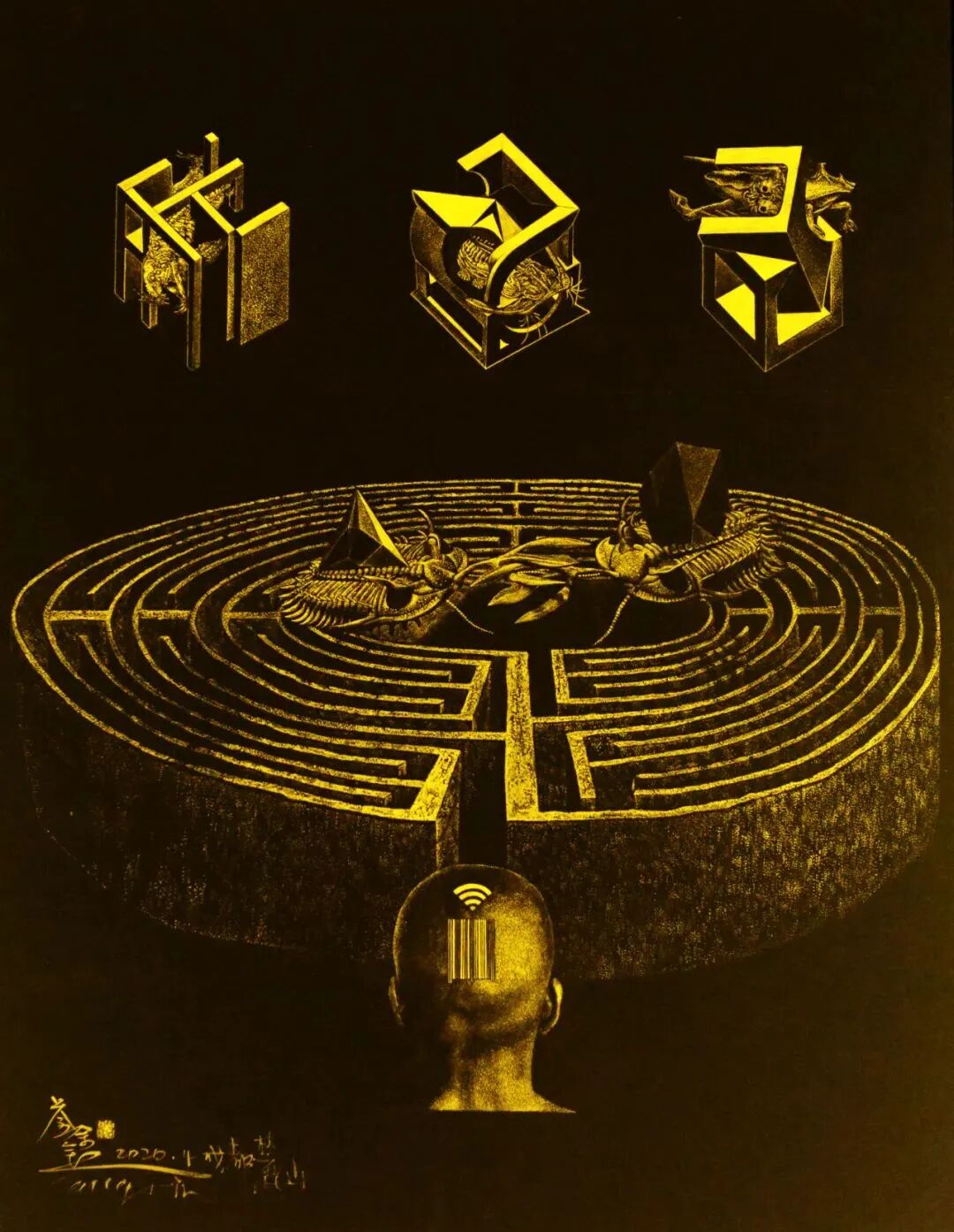 苍鑫,意识物化的推演模型系列·2,宣纸设金,172x132cm,2020