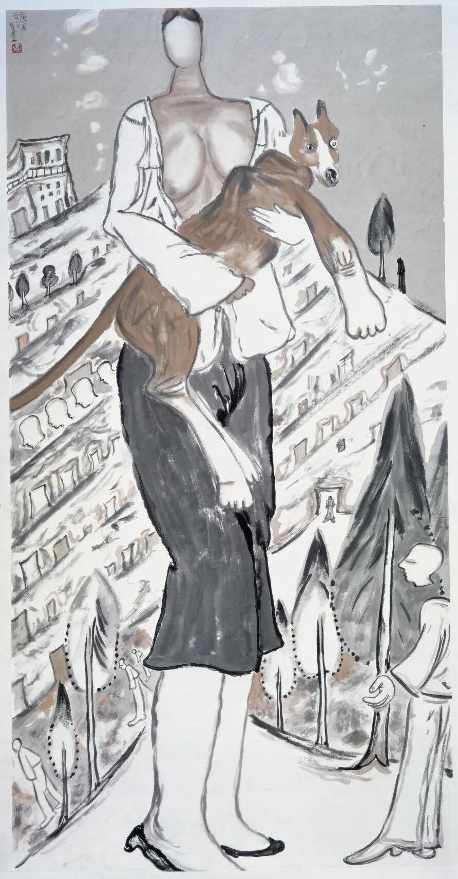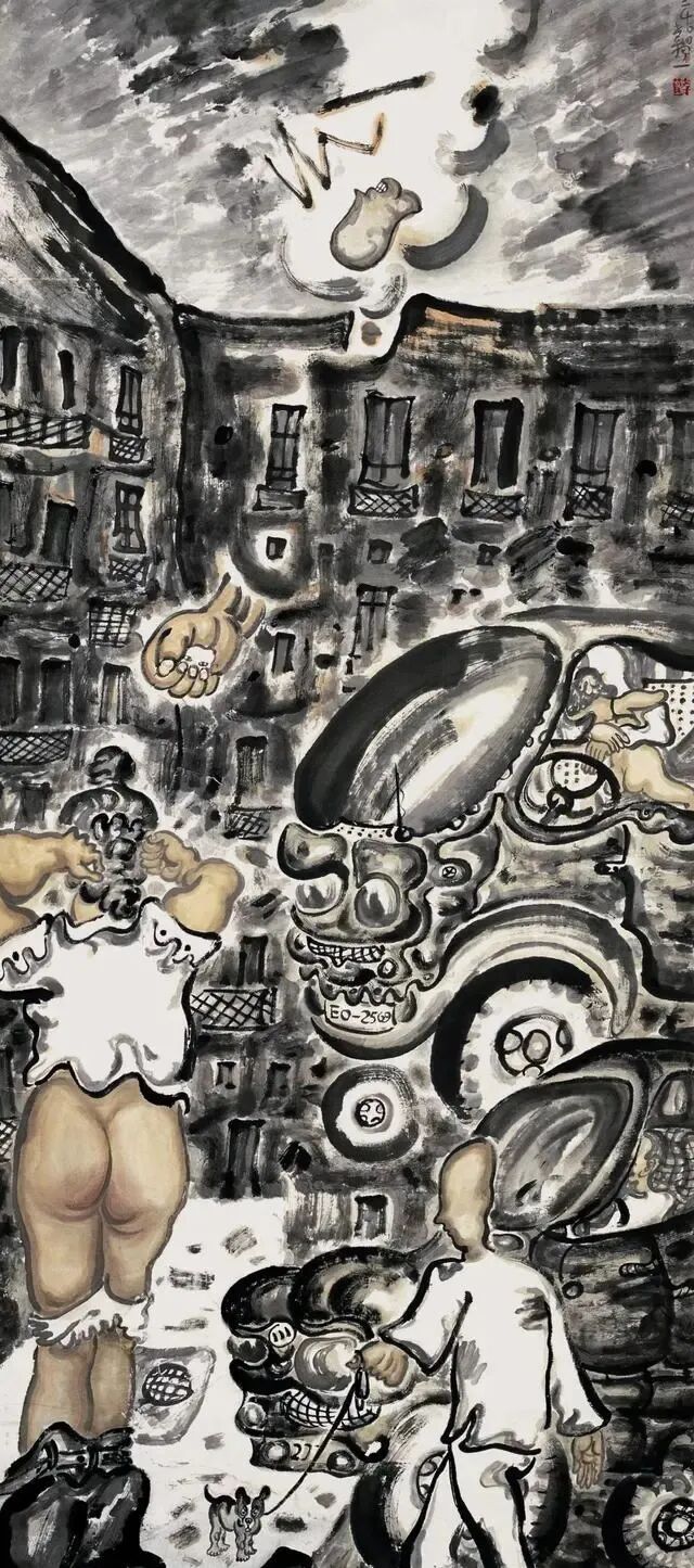 李孝萱《走入圈套的人与车》179x96cm 纸本设色 1998年·7