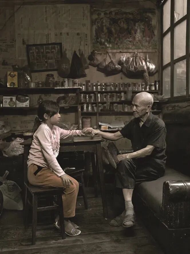 「家住洪江区古商城向阳坪21号邵长龙每天早晨坐在拥挤黑暗的老屋门前看着来往的游客。孩子们都渐渐长大了,他很想出去打工来改善家人的生活。」