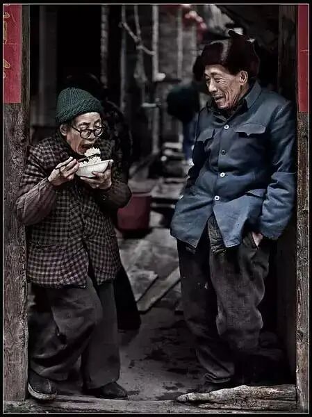 「古商城堡子坳17号。91岁的朱寿国老人(左一)与81翟光翠(右一)等在聊天,后边有几个小孩在玩耍。古商城里民风朴实,长寿老人多,且有着尊老爱幼的好传统。」