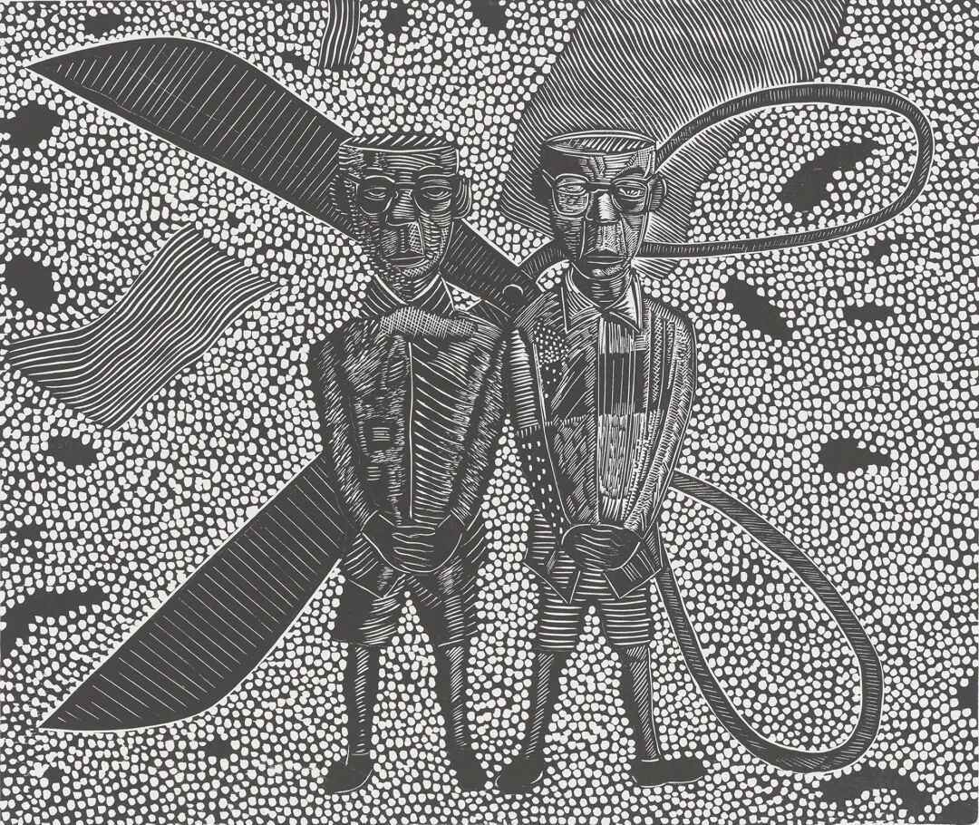 王华祥,《模棱辩证法》,黑白木刻,38×30cm,1996