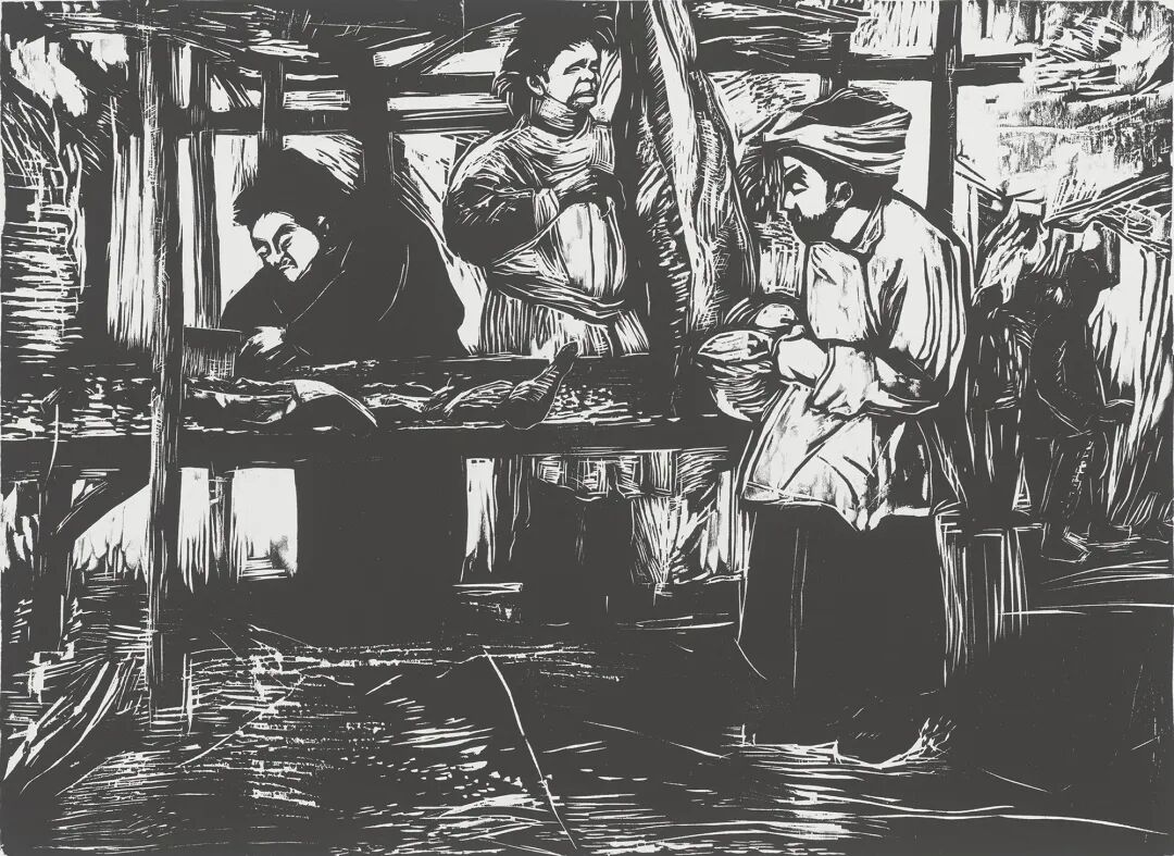 王华祥,《肉市》,黑白木刻,47x63cm , 1990