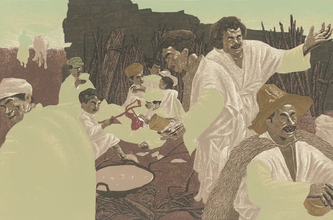 王华祥,《威宁集市》,彩色木刻版画, 78.5x51.5cm,1988
