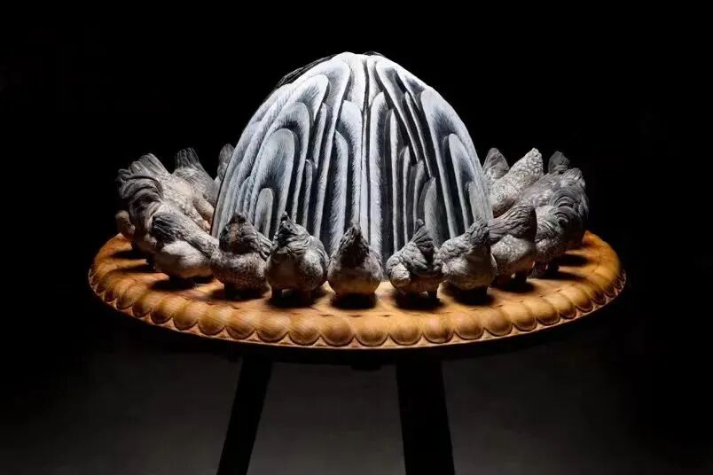 李占洋,《吃米》,陶、木,82×82×40cm,2021