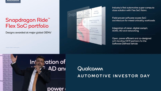 而刚刚,高通首届汽车投资者大会上,首款集成式超算级别的汽车SoC——Snapdragon Ride Flex也完成了首秀。