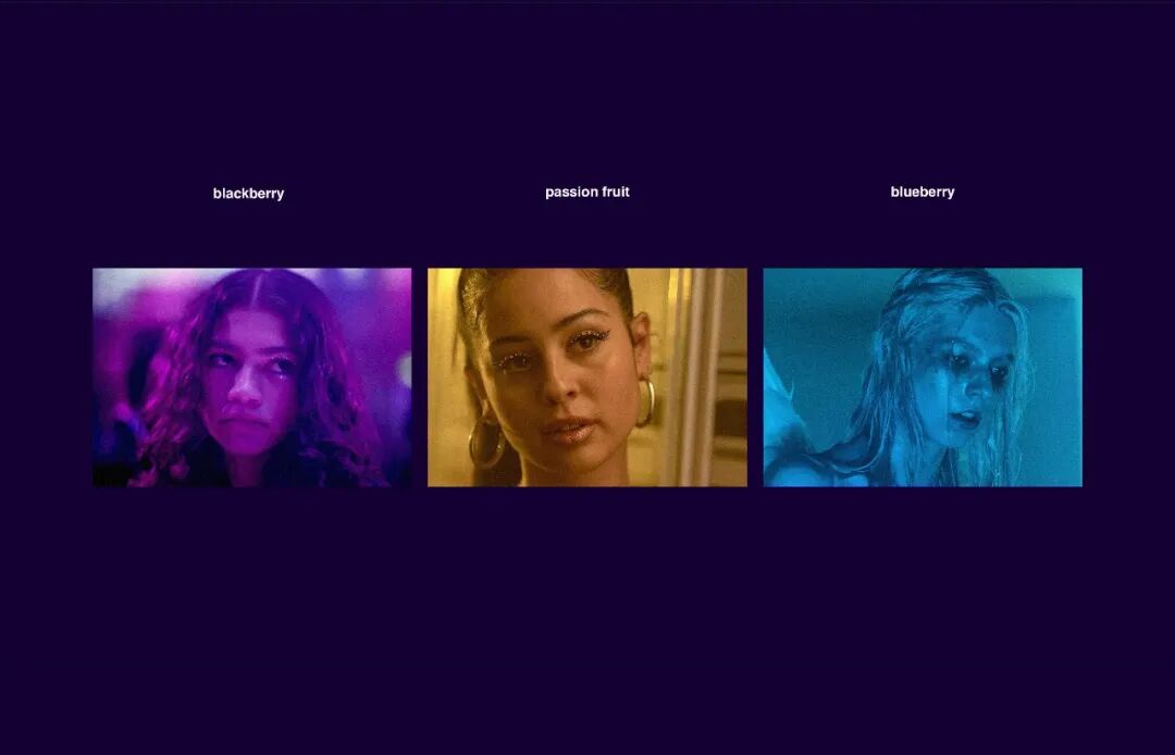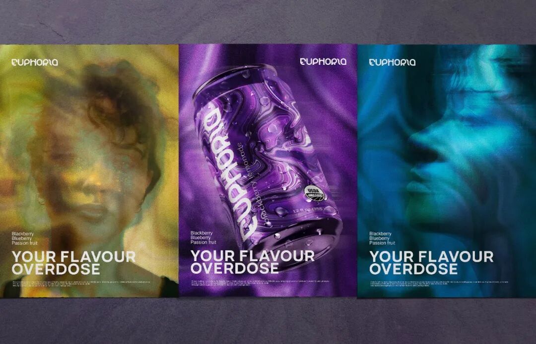将设计建立在迷幻模糊的波浪形元素上,以显示观看该系列的感觉。主要的颜色和口味是根据系列人物选择的:紫色代表黑莓,金色代表百香果,海蓝色代表蓝莓。