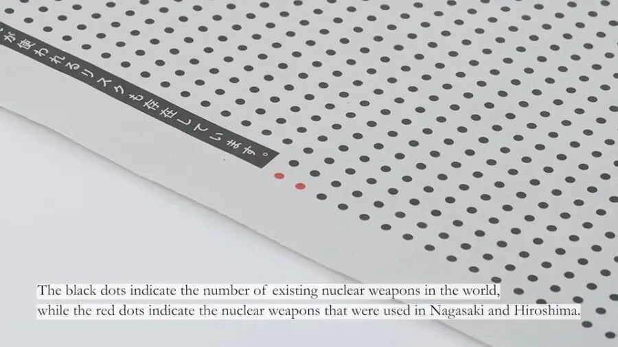 黑点代表的是目前全世界存在的核武器数量,两个红色圆点则象征76 年前,即1945 年8 月6 日至9 日,第二次世界大战在广岛和长崎投下的原子弹。