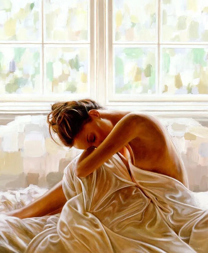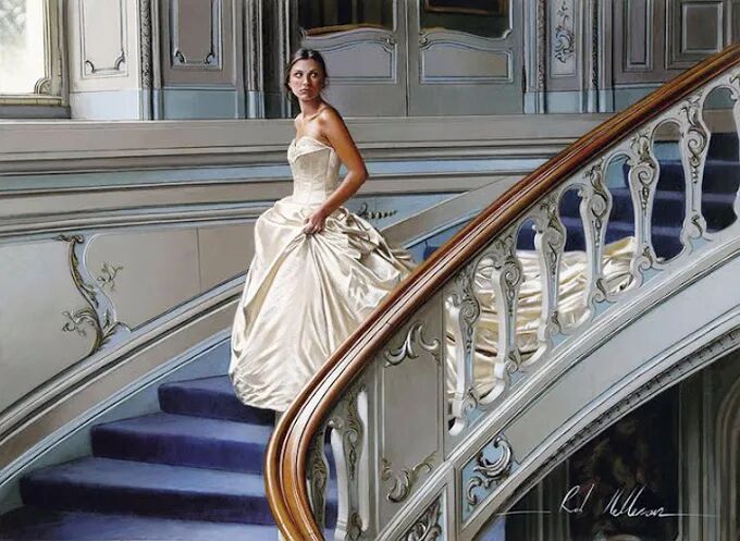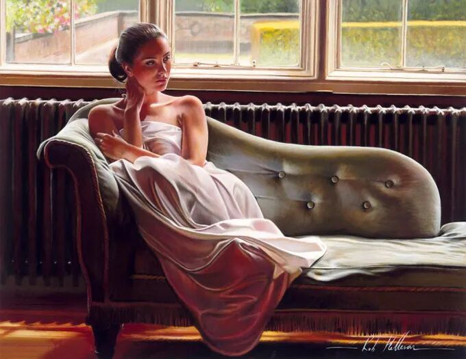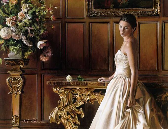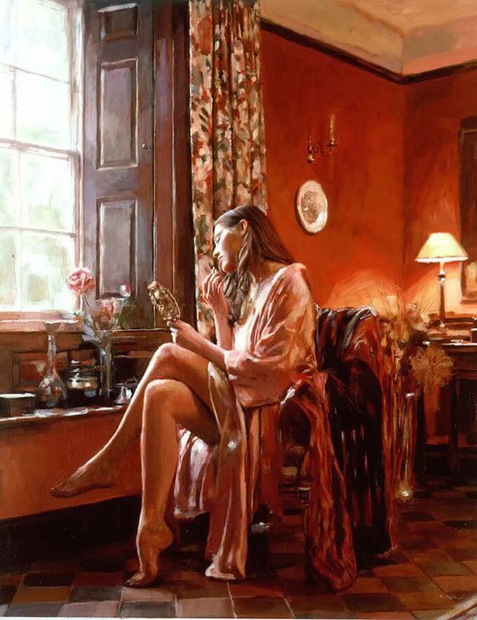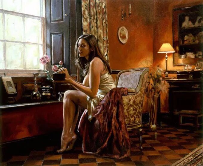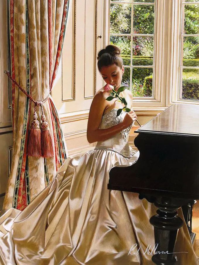 在他的作品中,女性主体普遍沉浸在感性和浪漫的氛围中。使所代表的主题十分和谐。画中的女人们面色安详,传递着一种甜蜜的期待和内心的幸福感。