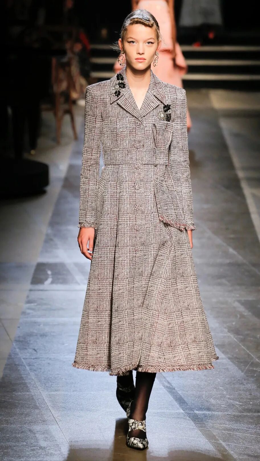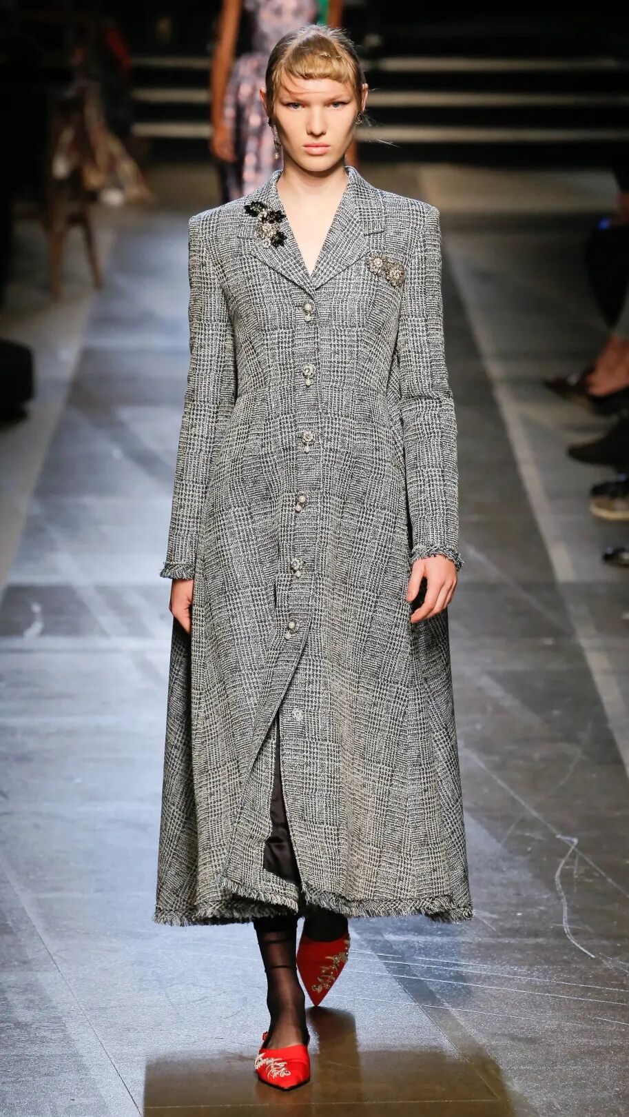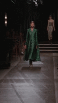 落落大方的A字外套,铺开了像块大面积窗帘布,但绝妙的剪裁让其行走中又能凸显身形。外套上面有细腻反复的花卉刺绣。