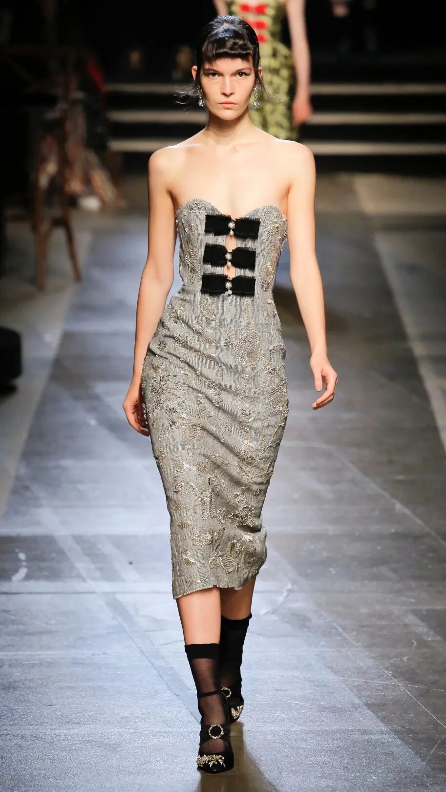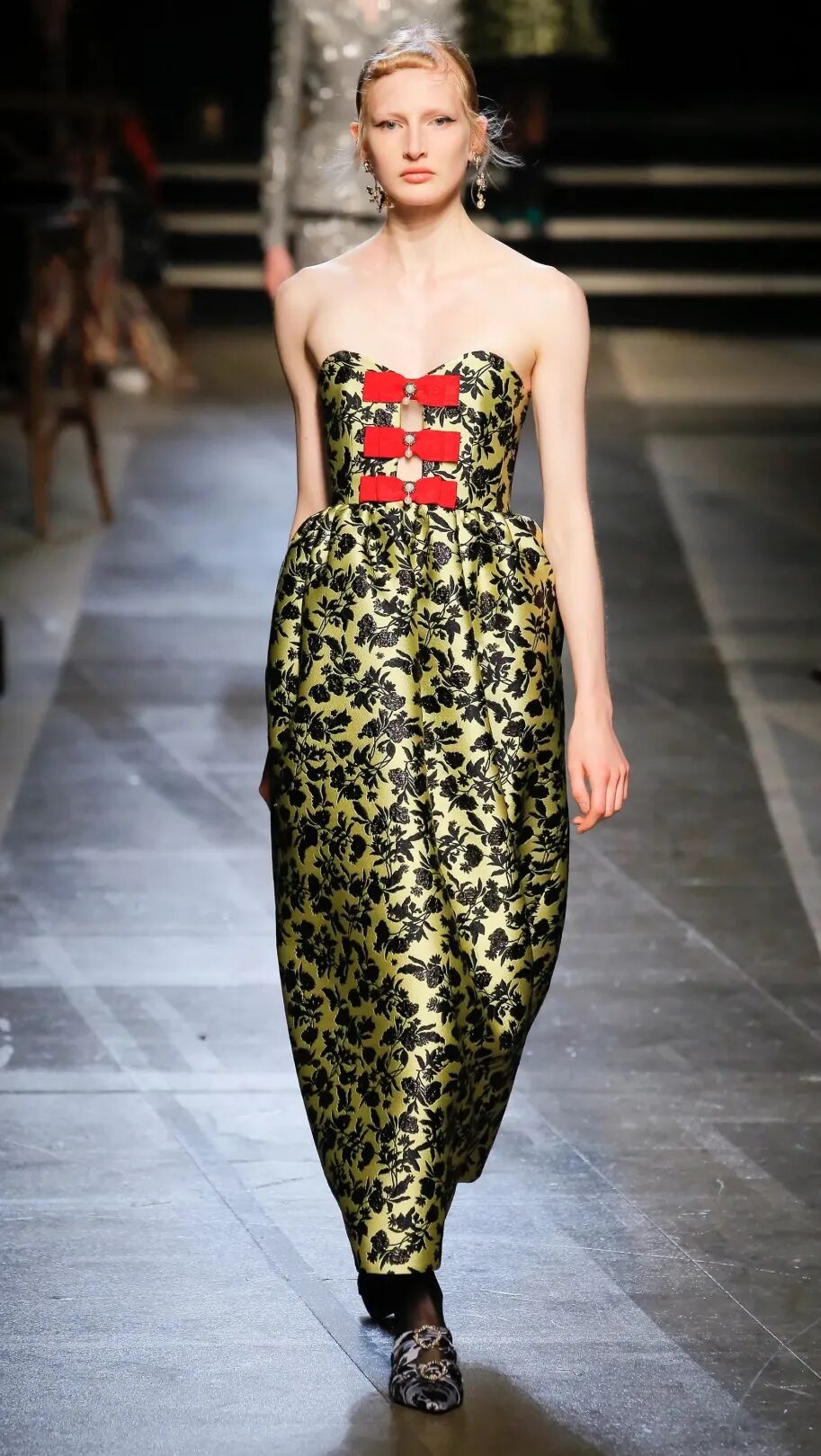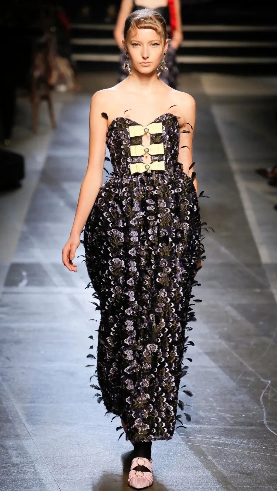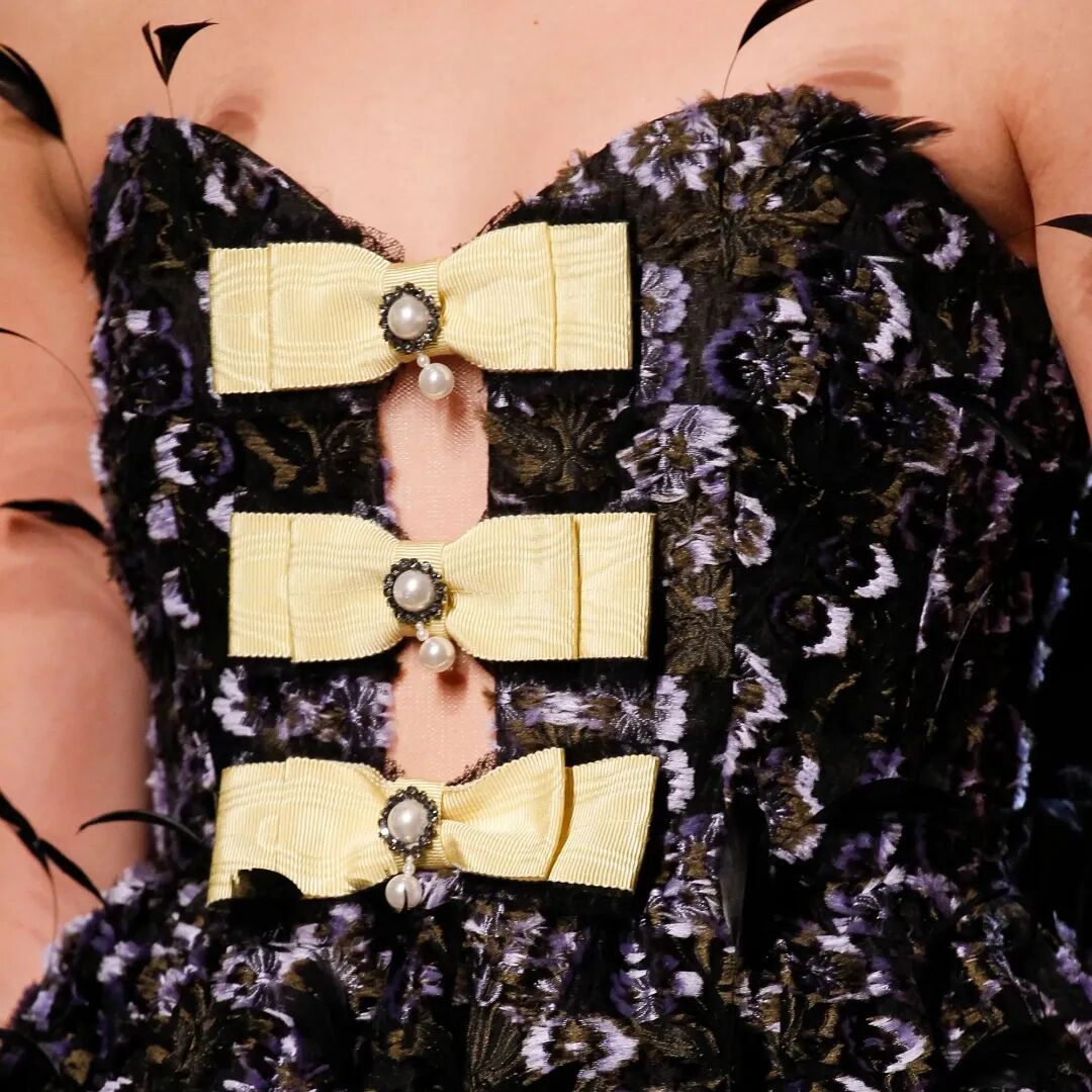 在那个年代,皇室偏爱将缎带结修饰在胸前。但Erdem Moralioglu做了更大胆的尝试,变得摩登且性感。
