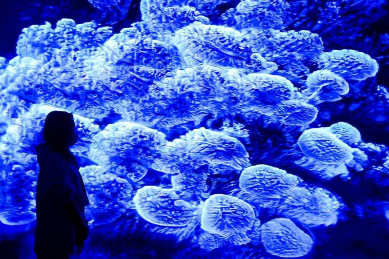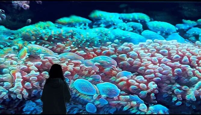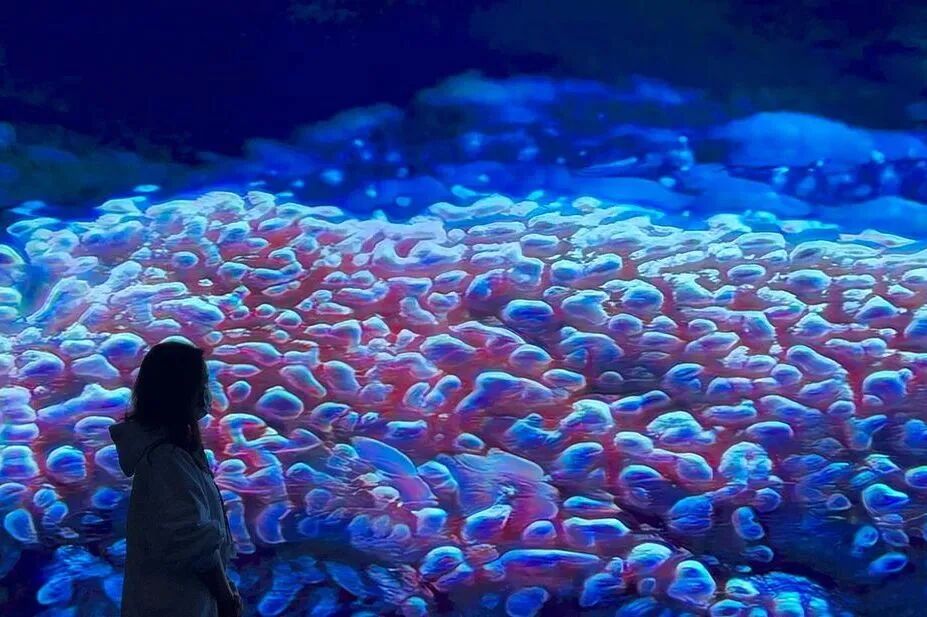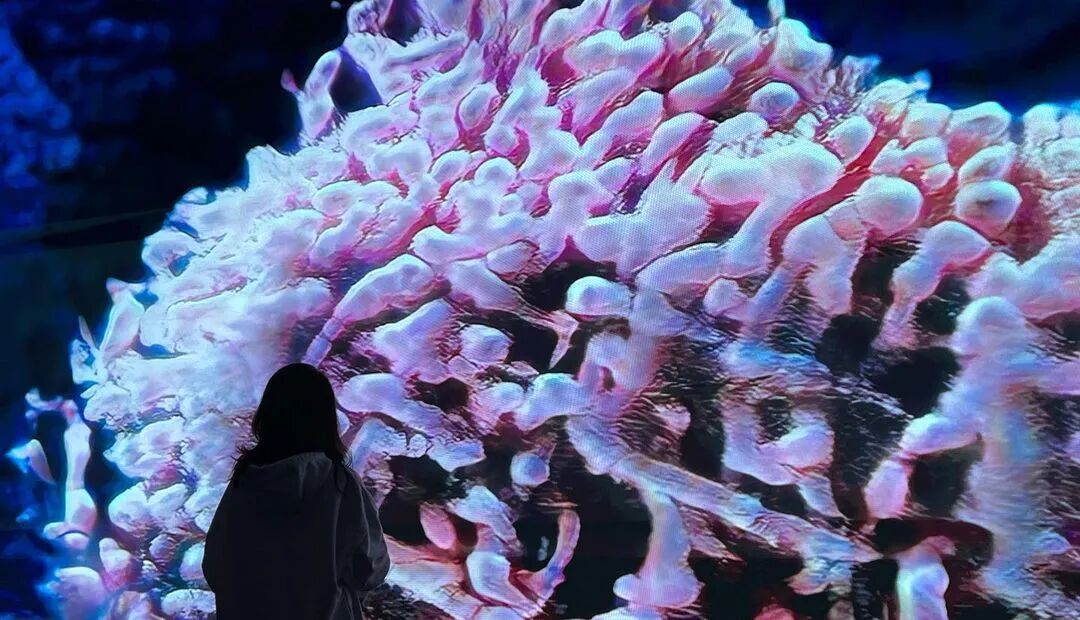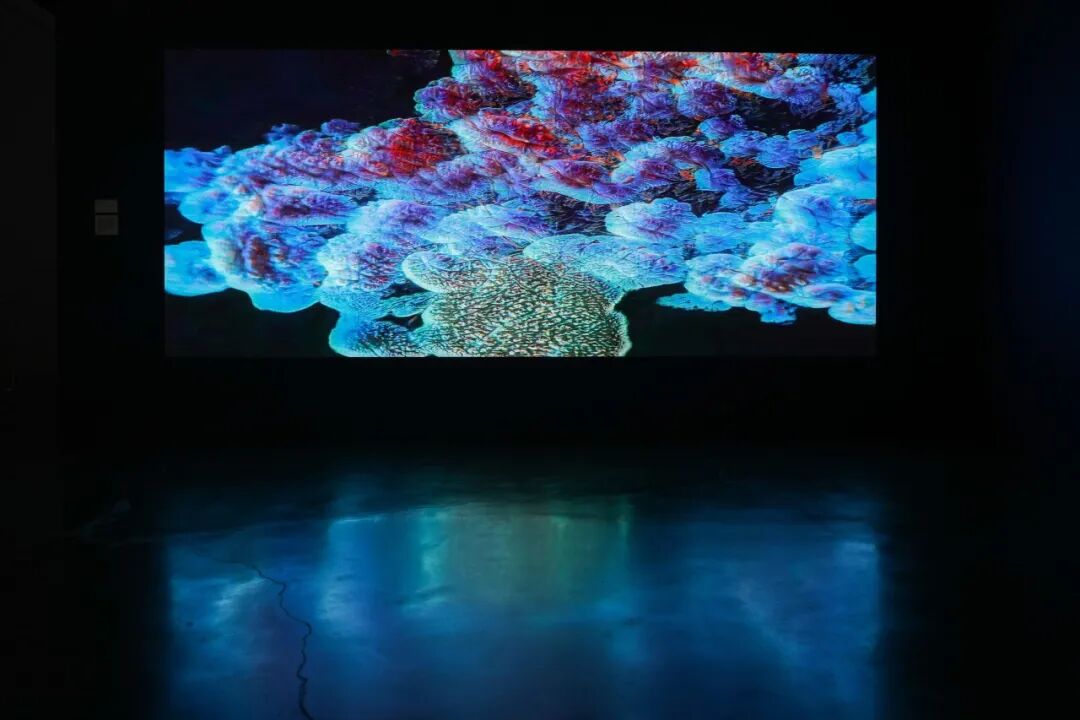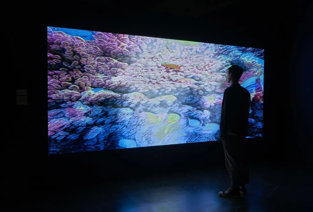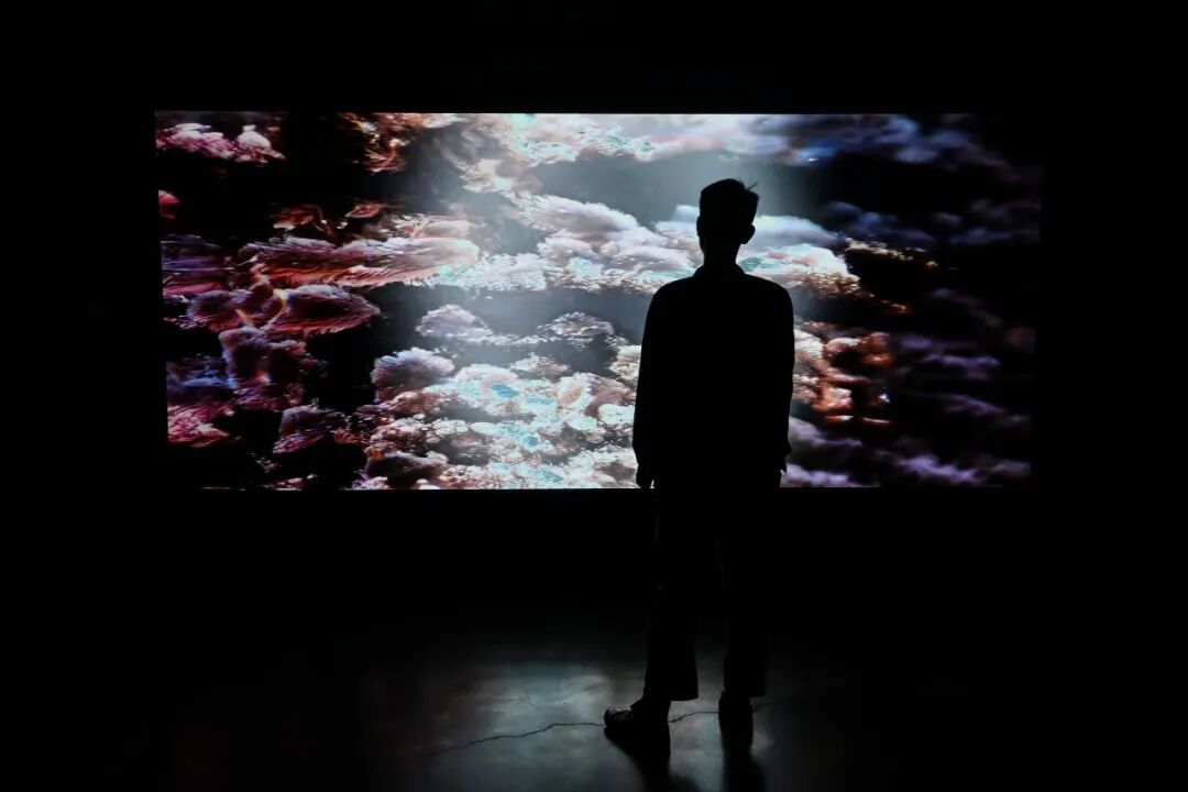 <YH>是一个人工智能生成的艺术品,它探索了我们对机器想象的自然体验。通过分析珊瑚礁的形状和颜色,人工智能创造了一个不断变化的、人工想象的水下景观,随着人类接近场景而变化。真正的珊瑚礁——由于人类活动而受到严重威胁——是由相互依存的元素组成的异常复杂的网络,实际上与某些人工智能网络的运作方式有一些相似之处。<YH>直接指出人类对自然世界的干扰,同时也将机器本身想象成自然世界的延伸,不希望被打扰。