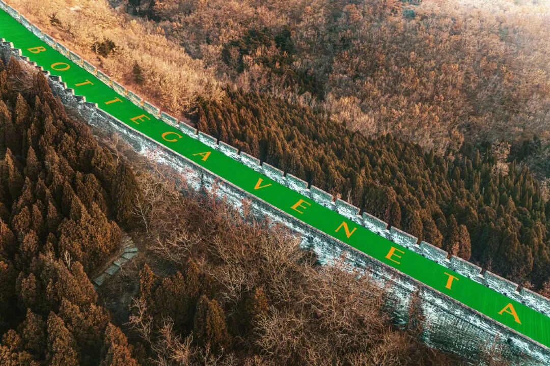 屏幕装置位于山海关角山长城。山海关地处万里长城的入海处,有「天下第一关」之称。在送上新春祝福的同时,Bottega Veneta还将赞助山海关景区与角山长城的日常维护与翻修。