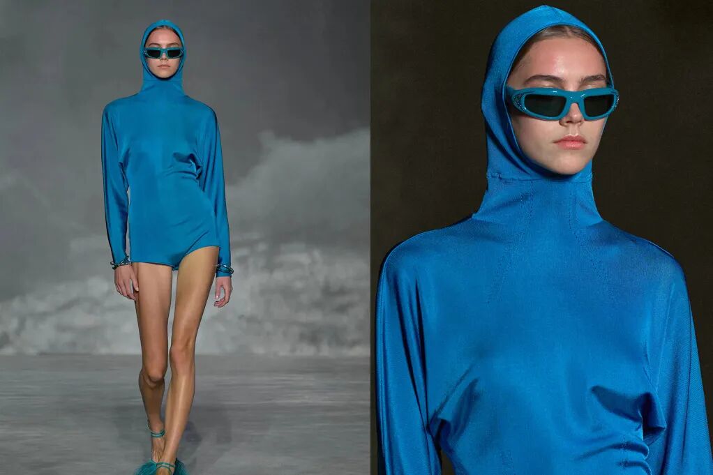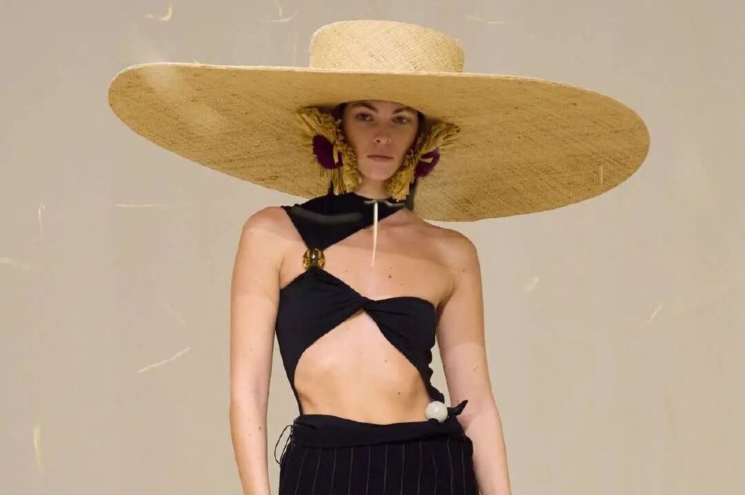发布秀以黑色、米白色、迎春花黄色三组代表色开场,硕大的草帽,性感的裙装和解构式的设计,奠定了本场发布秀既夸张又外放的基调。