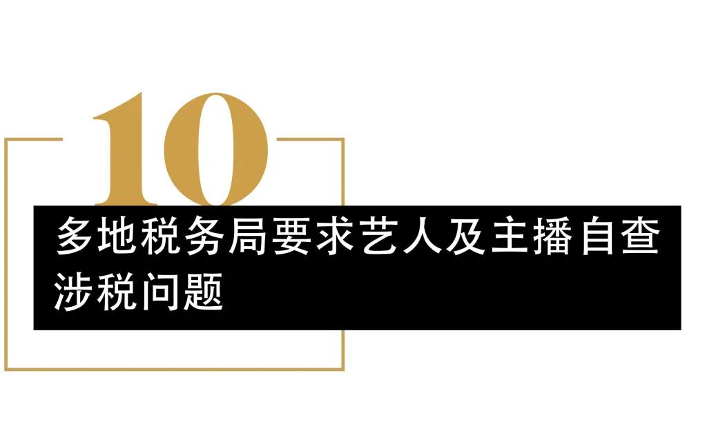 12 月 22 日,北京、上海、广东、江苏等地税务部门发布公告,要求此前尚未关注自身涉税问题或自查整改不到位的明星艺人、网络主播等,抓紧对照税法及有关通知要求进行自查,并于 2021 年底前向税务部门主动报告和纠正涉税问题,对仍拒不自查自纠或者自查自纠不彻底的,税务部门将依法依规严肃处理。