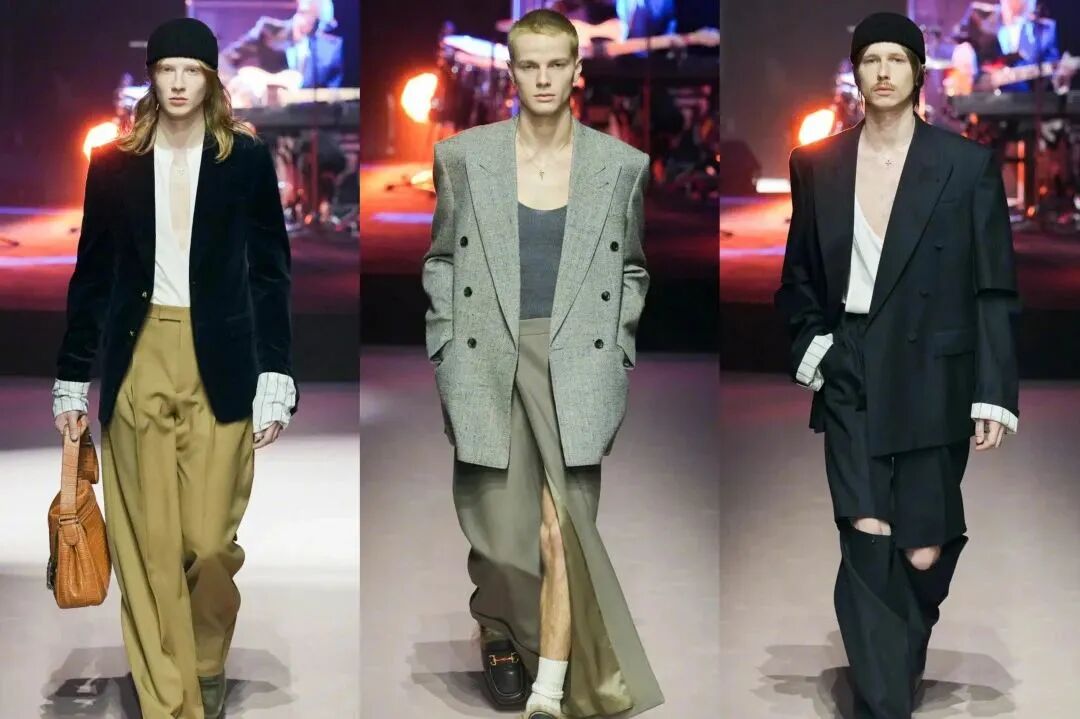 Gucci日前在米兰发布创意总监Alessandro Michele离职后的首个2023/24秋冬男装系列,系列产品和造型由品牌设计团队协作完成,以利落剪裁的大廓型为主,整体风格从此前的浪漫华丽变为嬉皮与叛逆,并重新演绎了Crystal GG、马衔扣以及档案库中的双G标识等品牌经典元素。