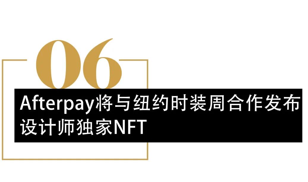 先买后付支付公司Afterpay已连续第三季与IMG合作,成为纽约时装周官方合作伙伴。在今年9月,时尚爱好者可通过Afterpay特别设计的NFT解锁进入纽约时装周,体验传统的专属产品,并拥有设计师创作的数字艺术品。