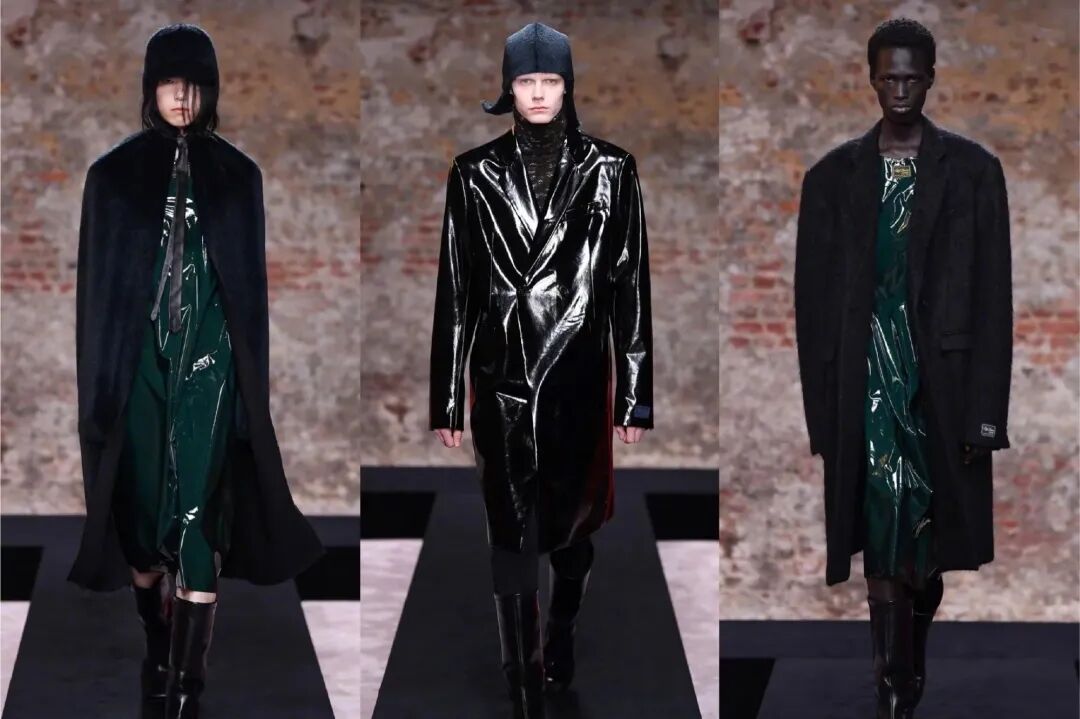 手捧花束的印花产生的错位视觉,在天鹅绒、尼龙、羊毛绒等面料加持的成衣极尽质感,以及各色乳胶制成的服饰让人感觉奇怪却诱人,依旧释放品牌叛逆基因分子。
