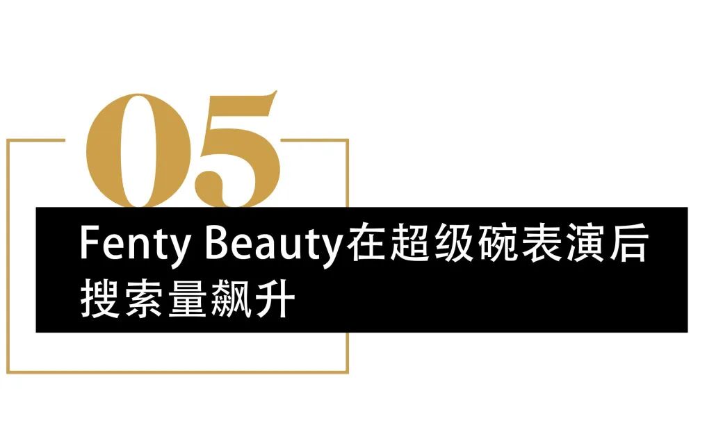 随后,Fenty Beauty的谷歌搜索量上升了833%,成为当晚搜索量第四大的话题。另据Launchmetrics的一份报告显示,在超级碗期间,Fenty Beauty的提及在前12个小时产生了560万美元的媒体影响价值(MIV)。