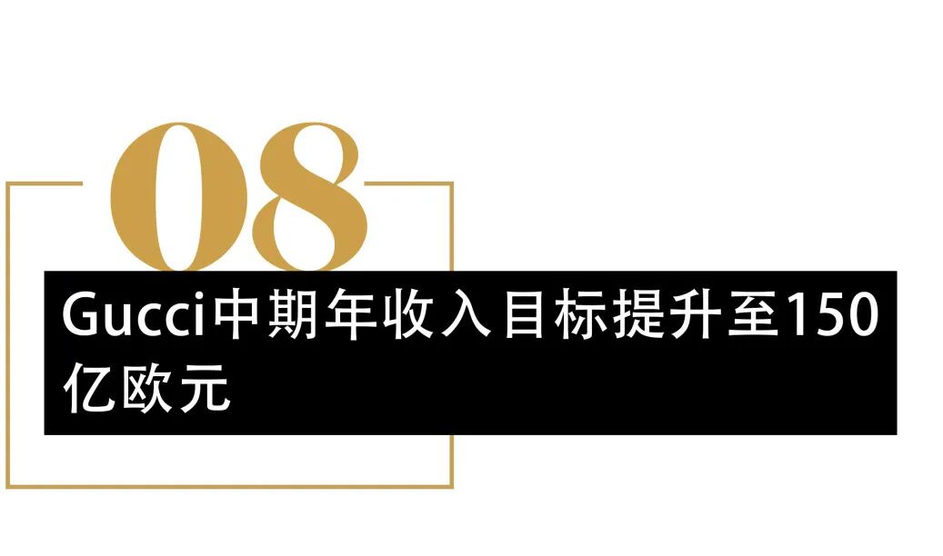 开云集团日前发布Gucci重振计划,中期目标是让Gucci的年销售额增长至150亿欧元,具体举措包括提升门店客流量、扩大门店网络以及继续提高产品价格、提高皮革制品在其销售组合中的比例等。