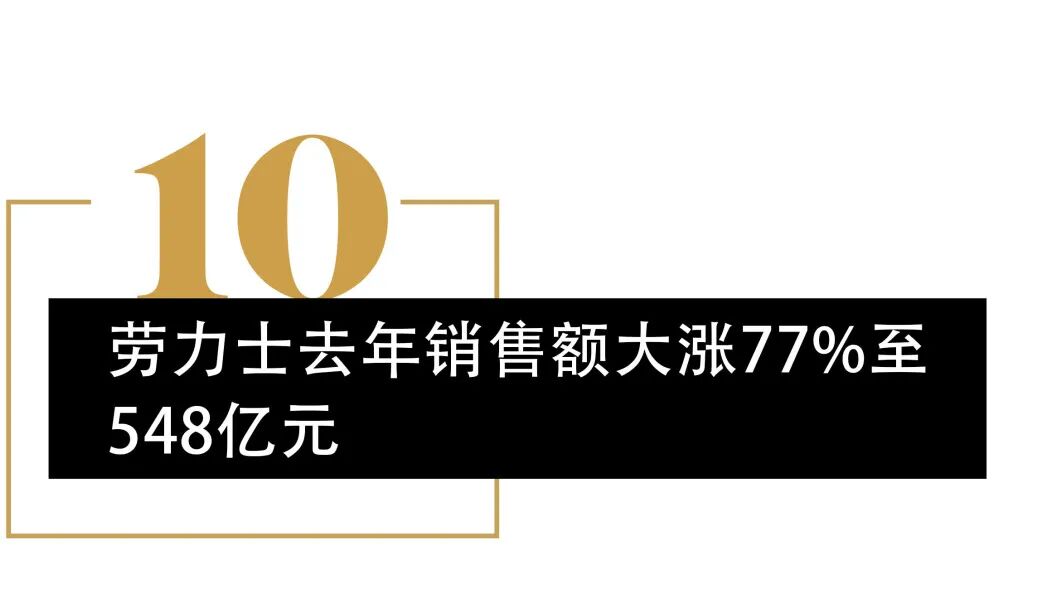 据投资机构摩根士丹利和LuxConsult联合发布的2021年瑞士钟表业的研究报告显示,劳力士是2021年销售总额最高的钟表品牌,同比大涨77%至80亿瑞士法郎约合548亿人民币,占瑞士钟表品牌市场份额的28.8%,是卡地亚、欧米茄、爱彼、浪琴、百达翡丽加起来的总和,年产量从2020年的81万枚提高至105万枚。