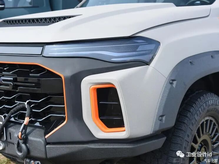 前脸部分,黑色中网周围搭配了富有活力的橙色元素,下方配有金属材质的竞技前保险杠,并带有拖拽力高达12000镑的电动绞盘。不过其发动机舱盖上的散热口仅为装饰。