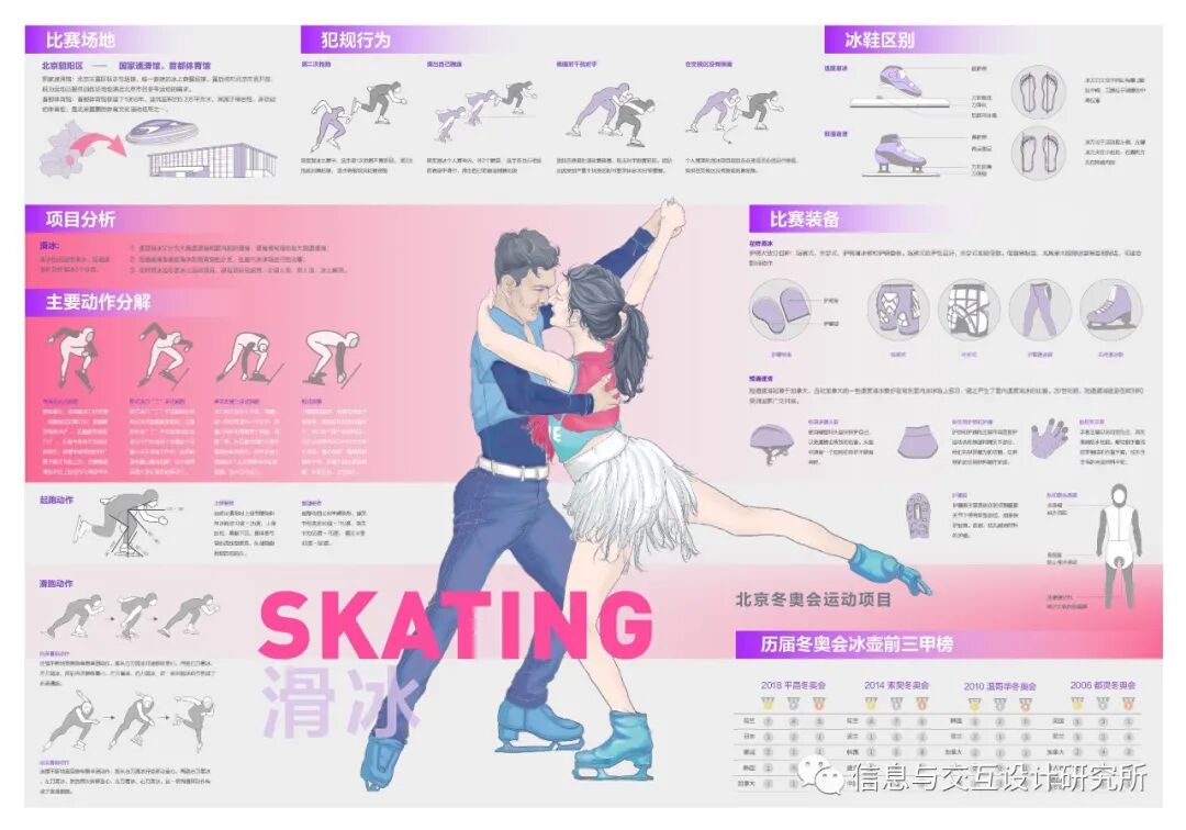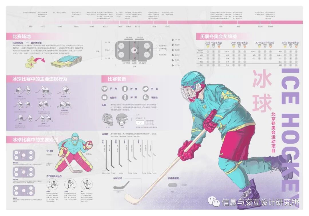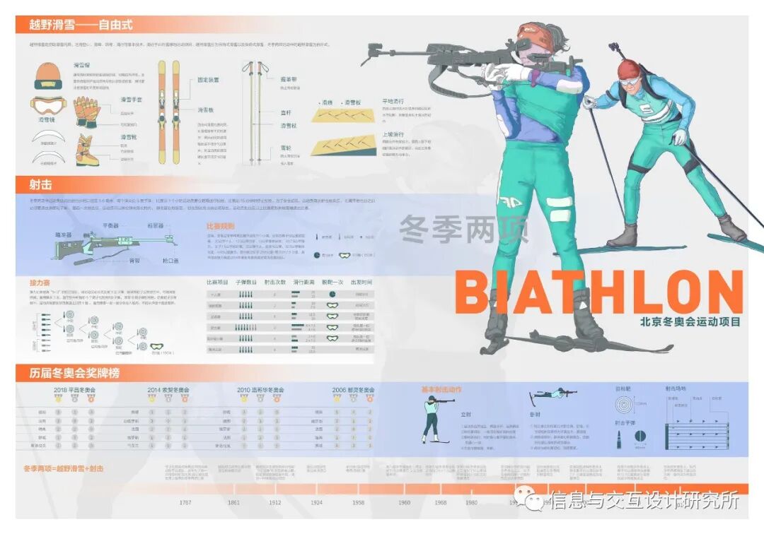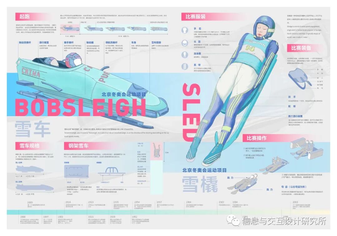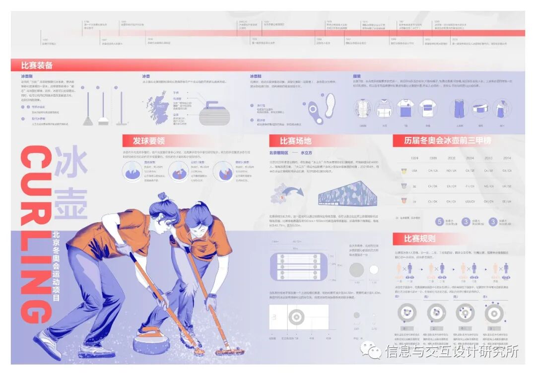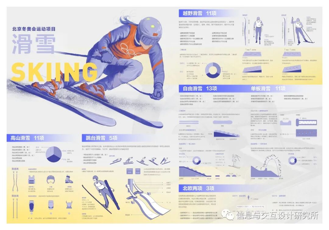 为了更直观地让大家了解到冬奥会运动项目的比赛场地、规则、运动装备等,作者以信息图解的形式展开说明,作品涵盖了北京冬奥会全部的七个大项比赛:冬季两项、滑雪、滑冰、冰球、冰壶、雪车和雪橇。