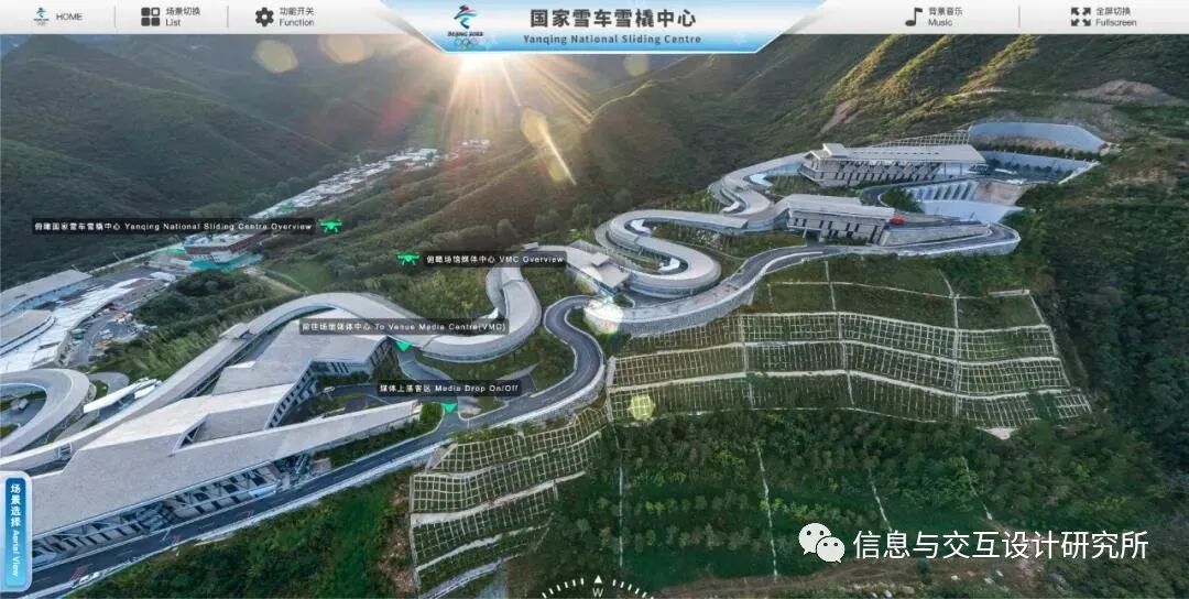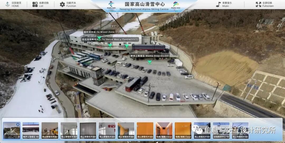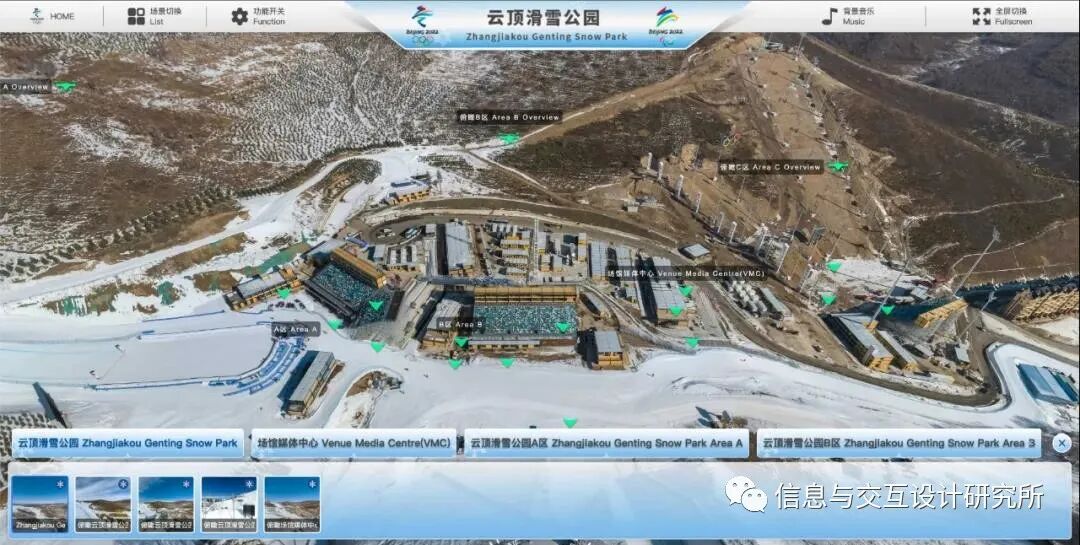 该系统以全景、全维的融媒体技术形式,通过高空航拍视角和720度地面全景视角,全方位、立体式的展现了北京、延庆和张家口三个赛区12个北京冬奥会竞赛场馆和3个冬奥村场馆的媒体中心,对场馆媒体运行功能区、媒体流线、场馆运行情况等进行了可视化的体现。