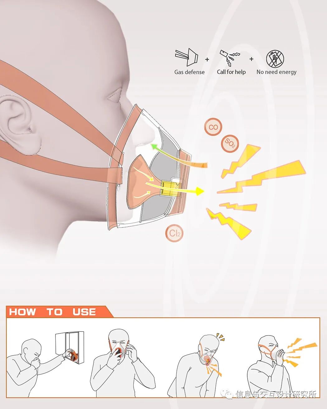 设计师在口罩中加入了一个哨子,使用者呼出的气体会通过导气罩传到哨子中。随即,哨子发出响亮的哨声,它能使使用者在佩戴口罩的同时进行有效呼救,从而提高获救几率。