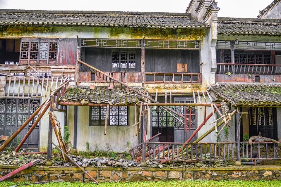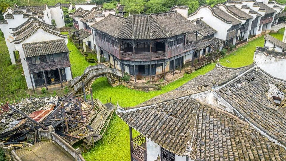 乍一看这些图片,或许你会以为这是一处未被保护的民居遗址。如果再凑近些,你就会发现破碎的立面暴露出的现代框架。视角再飞地高些,你就会看到和“中式”民居紧紧相邻的“西式”建筑。不同时期,不同风格的建筑被人为地拼贴在一起。或许这时你就能猜出,这里并不是一处历史城市遗址,而是一座被废弃的影视拍摄基地。