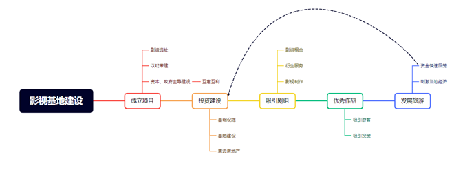 在城市建设的过程中能募集到巨量投资,大范围内促进就业,快速拉动建设周期内的经济增长。建成后影视旅游带来的的辐射效应提升了周边对住房、商铺等的需求,从而带动土地价格上涨,刺激地产商竞争开发。最终达到减轻基层政府的财政压力,最大化本地GDP的效果。影视基地好比一只蝴蝶,扇动一次翅膀就能带来一段时间内众多行业的蓬勃发展。