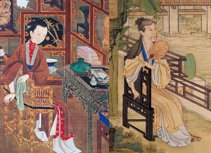 此对椅子将常见的靠背板用三根S形圆材代替,王世襄在《明式家具研究》中称此种造型的椅子“洞庭东、西山常见用榉木制者”,又称“梳背椅”。明何士晋汇辑的《工部厂库须知》卷九记载了万历十二年宫中传造龙床等四十张的工料价格:“御用监造成铺宫龙床。查万历十二年七月二十六日,御前传出红壳面揭帖一本,传造龙凤拔步床、一字床、四柱帐架床、梳背坐床各十张,……”其中“梳背坐床”,应为此类造型。梳背的造型其实是吸收竹家具工艺而来,在一些明清时期的绘画作品,如明崔子忠《杏园宴集图》,清《胤禛十二美女图》中都可以见到湘妃竹制的梳背造型的椅子。竹家具与明式家具互相借鉴、融合,发展出梳背南官帽椅的造型。