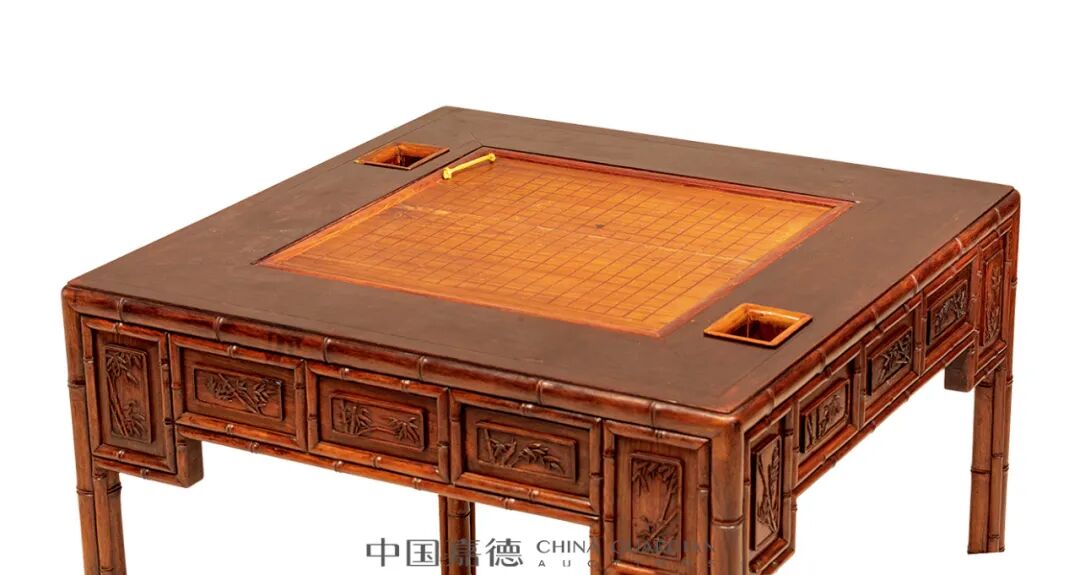 这是一张黄花梨仿竹节纹棋桌,方形,通体为黄花梨仿竹节纹圆材,桌面以格角榫攒边框,中间为可拆卸的方形棋盘。边抹下为相互连接的置物空间,并在桌面下以横向抽屉分隔空间,抽屉两面三具,两面二具,共十屉。抽屉面以格角榫镶嵌,开光内浮雕竹纹。抽屉两头靠近桌腿的位置各镶嵌一块竖直长方形板,类似于牙头,板面亦有开光,开光内浮雕竹纹。如此,三个抽屉和两块竖板便构成了桌面下一侧的牙条和牙头,粗看似竹竿拼接而成。因为桌面下储物空间的存在,棋盘下便也有一层储物空间,而此桌做成了双陆棋盘,极其隐蔽,这或许与双陆棋在清朝被禁止有关。四腿足劈料做,以粽角榫与桌面相接,腿足呈三根竹竿捆绑状,并在足端雕出捆绑的绳纹,极其逼真。