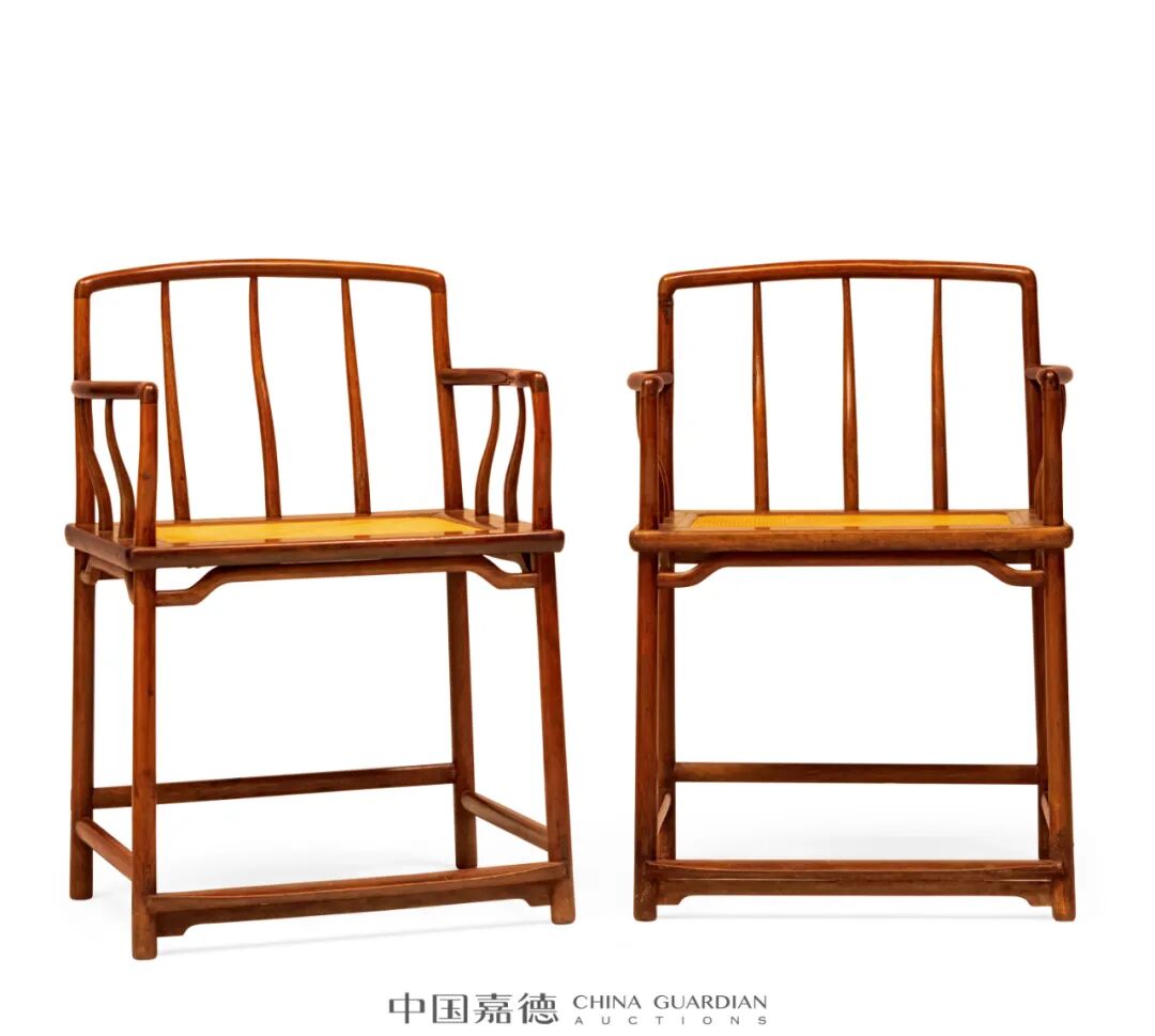 此对椅子以黄花梨制,以竹制家具为范本,通体圆材,搭脑弧形,中间高,两头略低,挖烟袋锅榫与S形后腿上部相接,在搭脑与后腿上部构成的方形空间里安梳背,梳背为均匀分布三根S形上细下粗的圆材,弧度与后腿上部一致,应是为了乘坐舒适。扶手、鹅脖、联帮棍亦为三弯式,联帮棍两根,与梳背一样,均上细下粗均匀分布在扶手以下的空间里。这种上细下粗的造型,将视觉重心引到座面,使椅子上部充满轻灵感,也使整把椅子显得牢固稳重。鹅脖与前腿一木连做,与扶手以烟袋锅榫相接。座屉以格角榫攒边镶嵌席面,下有两根穿带,边抹素混面,可见明榫。腿足圆材,座面下四边安顶牙罗锅枨,腿足间安步步高赶脚枨,并以明榫与腿足相接,正面为脚踏板。整体造型上弯下直,曲直相合,沉稳大气,而通体光素,更显简约温婉。