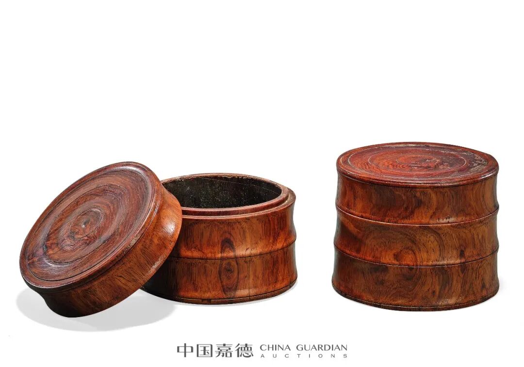 此对围棋罐以黄花梨制,仿竹节状。罐身上下等分为三截,下部两截为罐身,上部一节为盖,以子母口相连,纹理连贯。其间以阴线刻描绘竹节相接的形态,底和盖分别镶圆形板材,并雕出竹子断面的纹理,十分逼真。以硬木仿竹制家具,在清朝十分流行,这与竹家具的盛行有关。