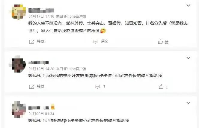 表达激进一些的年轻人张嘴就是一句遗言:以后我死了,麻烦亲友把《甄嬛传》和《武林外传》的碟片烧给我。