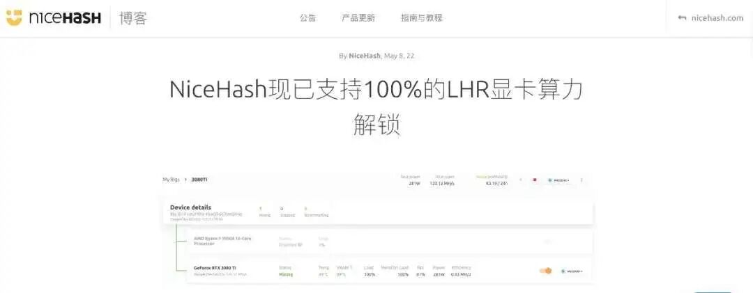 5 月 7 号,NiceHash 团队宣布,在 Win 系统下,他们已完成对 ETH 算法的算力限制破解,除了 RTX 3050 和 RTX 3080 12G 外,RTX 30 全系显卡都可获得 100%的哈希率。