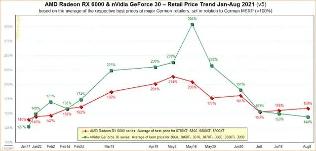可以看到随着供需关系的变化不论是 A 卡还是 N 卡都经历了一波惨无人道的涨价,就算二手市场的价格也居高不下。