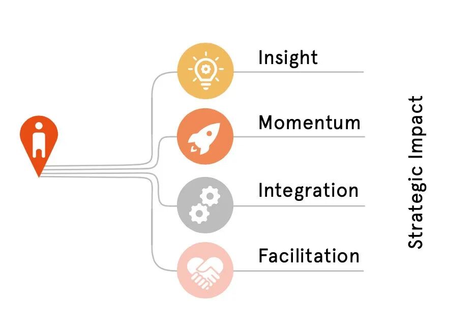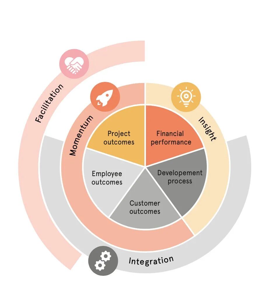 总而言之,这四种利用设计超越服务和产品开发的途径开辟了战略组织影响的独特但互补的领域。因此,评估它们的有效性也需要不同类型的指标。例如,洞察力和动量都侧重于所追求的价值,但在为战略工作提供洞察力时,特定市场的财务绩效指标可能更合适,而项目级别的财务绩效可能更适合产生动力的举措。