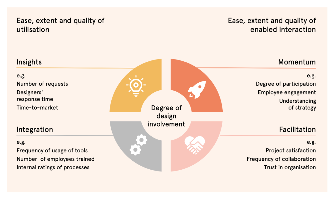 — 支持发展的形成性指标:使用设计方法的程度,通过例如设计师参与的数量、使用方法和工具的计划的百分比、培训的员工数量、内部工具的下载以及对价值和有用性的内部反馈进行评估