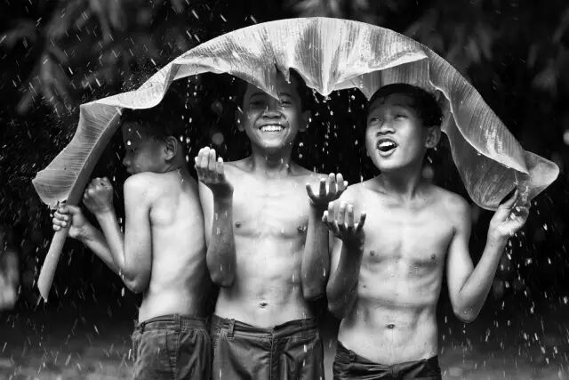 评委点评:三个兴高采烈的男孩使用一片香蕉树叶做遮蔽,在迎接雨水的到来,照片采用黑白两色精美地表现主题,看起来是在传达一段更为久远的过去时光,这是大多数人都十分珍惜的与儿时伙伴之间的联系和共同去过的地方。—— Kim Lau 新加坡