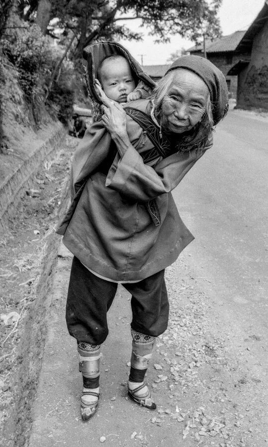 《背着重孙女的小脚女人》(2002年摄于云南罗平 135黑白胶片)