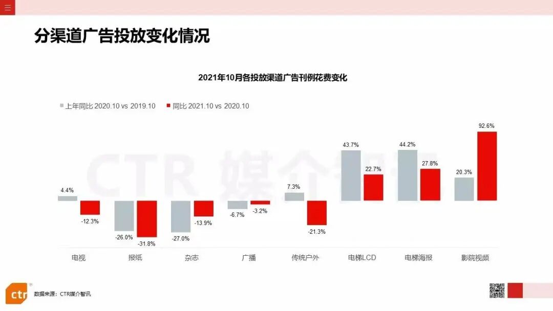 媒介触点协同就像做投资,必须选择确定性较高的媒体。用关注度高、信任度高的媒介,方可助力品牌实现可复制、可累积、可叠加的战略目标。CTR媒介智讯的广告投放监测数据显示,2021年10月,各品牌在电梯广告的投入同比去年增长22.7%,双微一抖一分众成为了很多品牌打造品牌力的核心方式。以分众传媒为代表的日常生活场景的品牌引爆,和以微博、微信、抖音为代表的社交媒体品牌种草,两者的交互和共振是助力品牌增长的核心阵地。