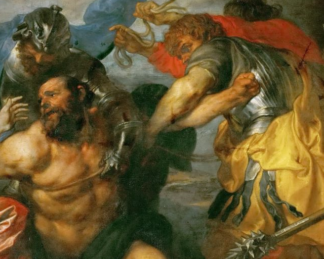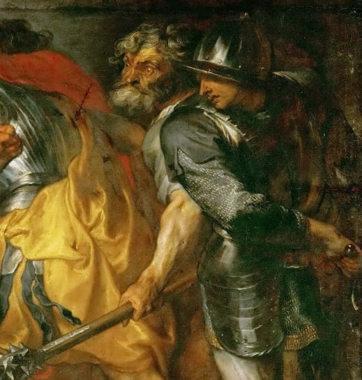 许多画家选择表现参孙被剪头发的场景,但这里画的是参孙失去头发并被士兵逮捕的场景。与沉睡中的懵懂不同,此时的参孙惊魂未定,悲痛与悔恨交织,加重了主人公陨落后的强烈情绪的流露。