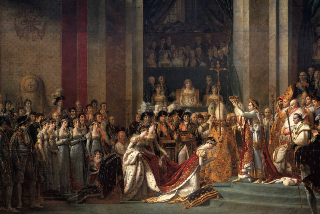《拿破仑一世加冕大典》是一幅面积达60平方米的巨幅画作,画里有100多个人物,描绘了拿破仑在加冕之后准备为他的妻子约瑟芬戴上皇冠的场景。