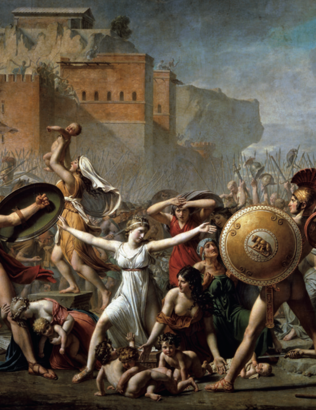 大卫在这里展现的情节不是著名的绑架萨宾女人事件,而是塔提乌斯率领的萨宾人意图救回被罗慕路斯率领的罗马人所绑架的女人的时刻。