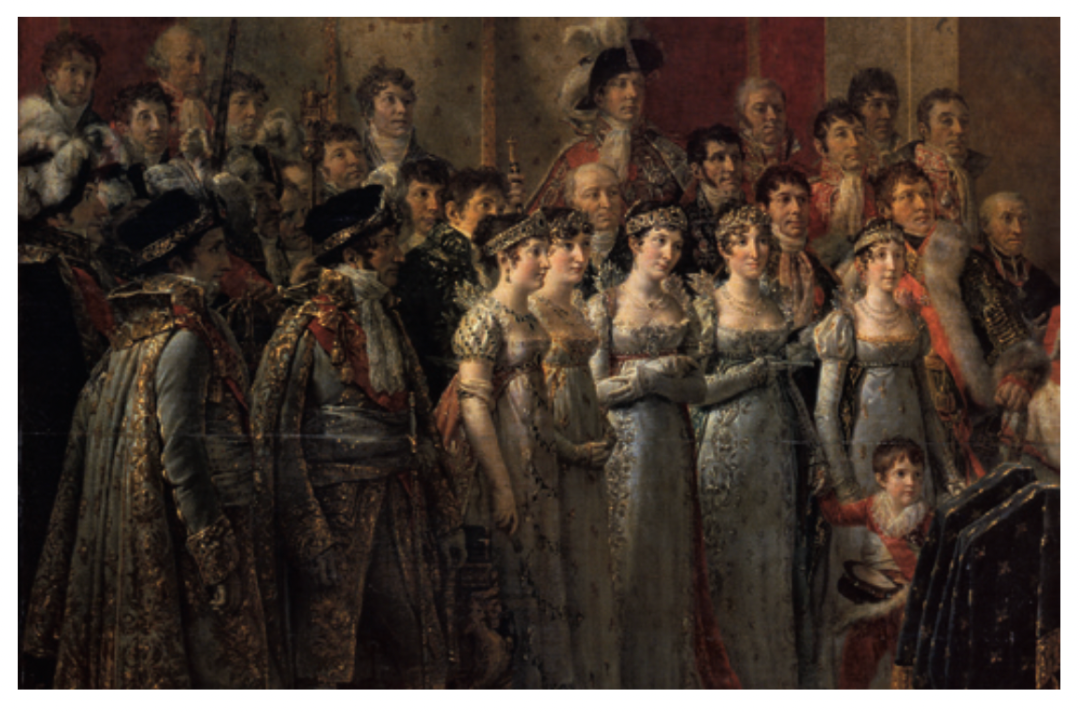 拿破仑的兄弟姐妹们盛装出席,前景从左到右分别是拿破仑的哥哥约瑟夫和弟弟路易,妹妹爱丽丝、波利娜和卡罗琳,继女奥坦丝·德·博 阿尔内和她的儿子拿破仑·查尔斯·拿破仑,奥坦丝的右边是约瑟夫的妻子朱莉·克拉里-贝尔纳多特。