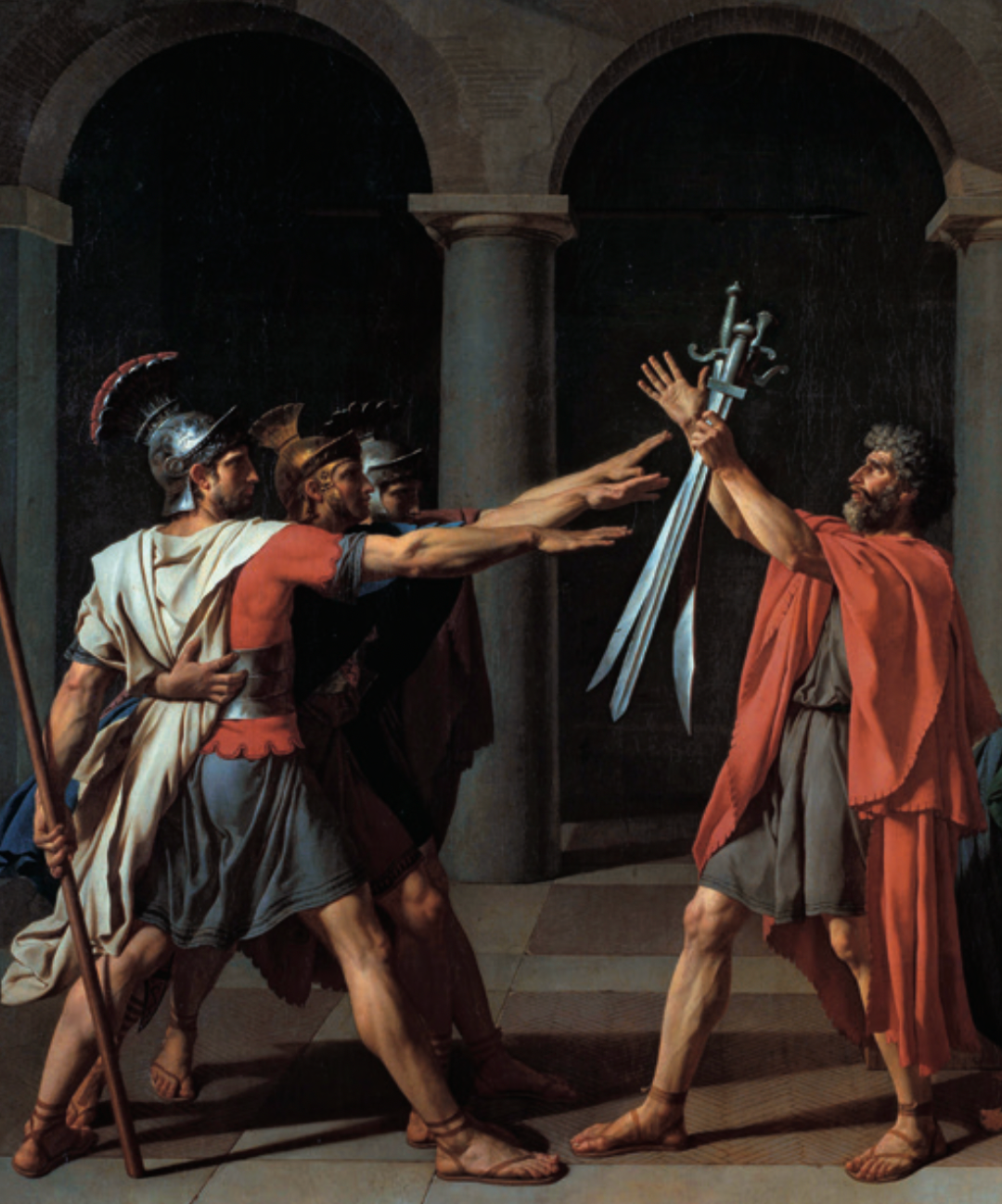 整个构图建立在女性的悲伤和男性的英勇这两种情感的对立之上。三兄弟迎向父亲,这一动作突出了三把兵刃的存在,让人产生身临其境之感。