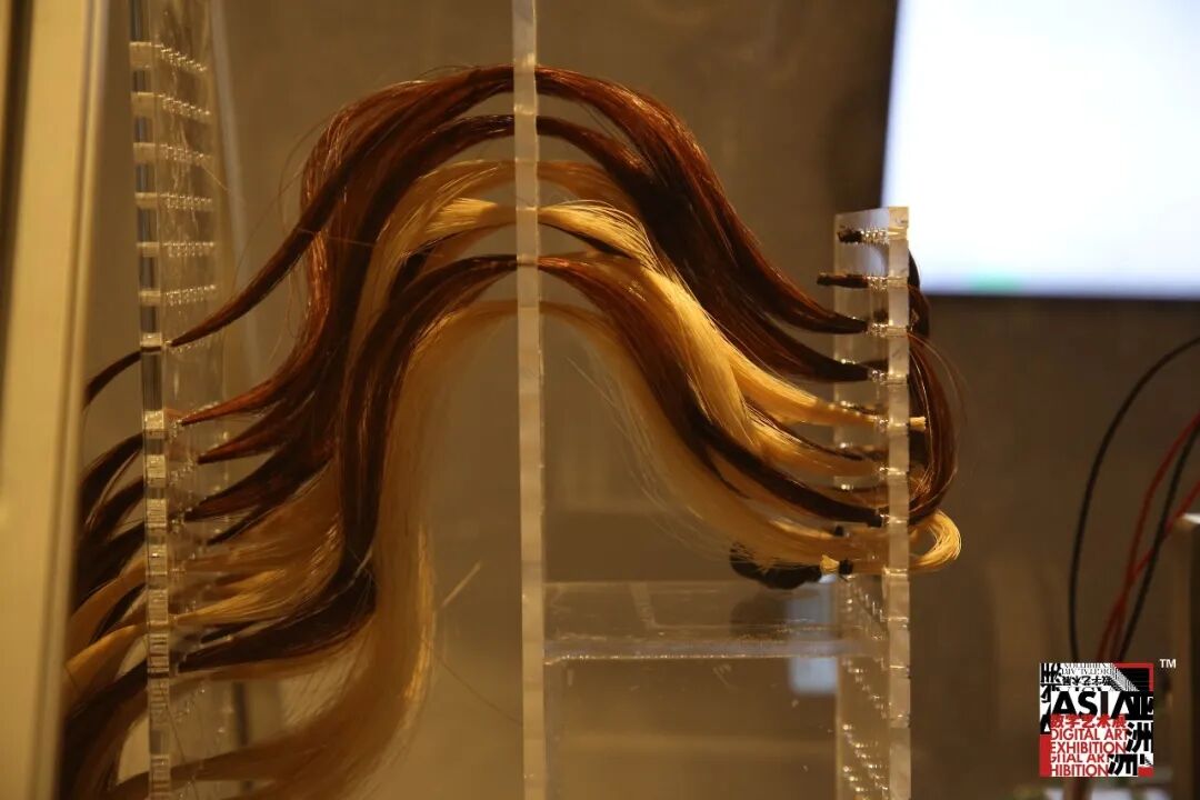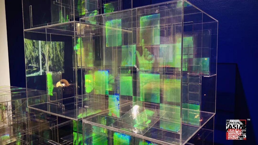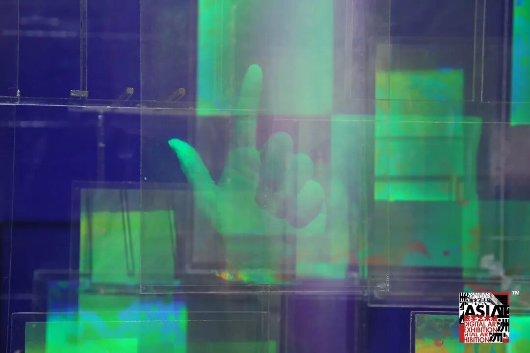 作品《触手可及》是对“手与感,手势与暗示”的探索。绿色的手处于光下,置于光中,借光而发光,由光而生光,因光而存在,它们相互关联,相互作用。以手为载体,通过对手的探索,试图寻找自我的生态平衡,在左手与右手之间形成对话,超越手势本身思考,思考自身的操作能力与操纵潜能,将取与舍、得与失、虚拟与现实、数字与计算、数码和情感结合起来。所有的感官、存在都融合在这个透明交织的多维空间中。